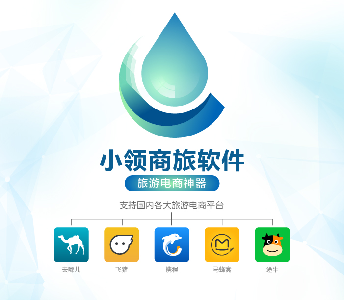 小領(lǐng)商旅軟件,旅游電商神器,國內(nèi)各大旅游電商平臺(去哪兒,攜程,途牛,飛豬,螞蜂窩...)均可支持:機(jī)票集成,價格更新,排名分析,價格對比,做電商就是這么容易!。